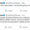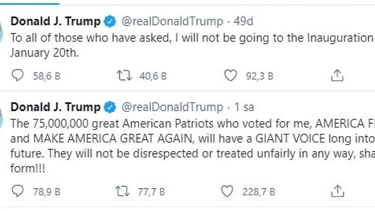 paylaşımında, Biden’ın 20 Ocak’ta Washington’da düzenlenecek yemin törenine katılmayacağını belirterek, “Bana oy veren 75 milyon vatansever, Amerika’yı tekrar harika yapacak ve gelecekte de yüksek sese sahip olacak. Hiçbir şekilde saygısızlık veya haksız muamele görmeyecekler” ifadelerini kullandı.