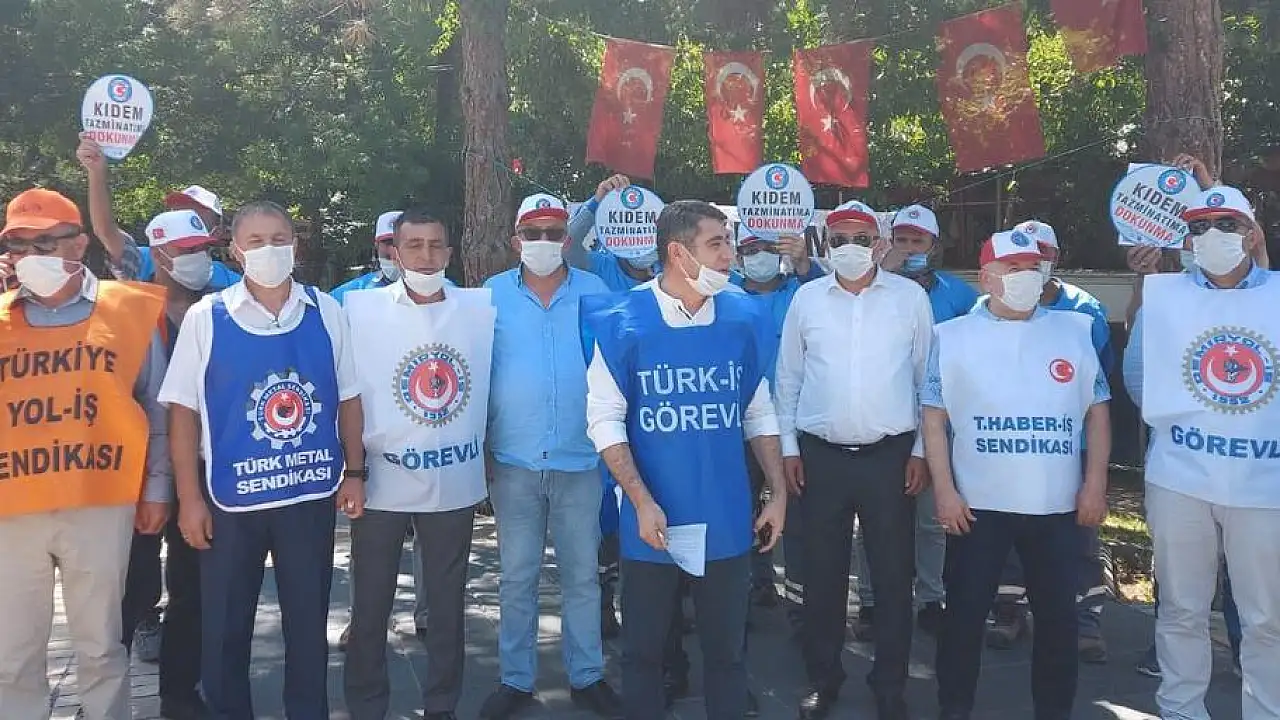 Türk- İş’e bağlı sendikalar, kıdem tazminatı hakkının ellerinden alınmamasına yönelik Cumhuriyet Meydanı’nda bir araya gelerek basın açıklaması düzenlediler. Düzenlenen basın açıklamasında kıdem tazminatının işçi ve ailesinin güvencesi olduğunu belirttiler.