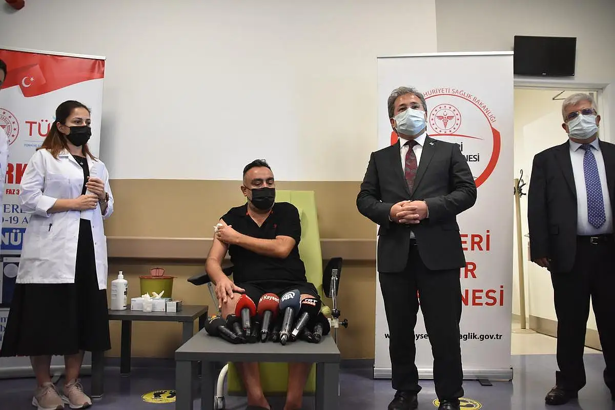 Erciyes Üniversitesi’nde çalışmaları yürütülen yerli koronavirüs aşısı Turkovac'ın Faz-3 çalışmaları kapsamında, Kayseri Şehir Hastanesi’nde 46 yaşındaki Sınıf Öğretmeni Murat Dağ’a uygulandı.