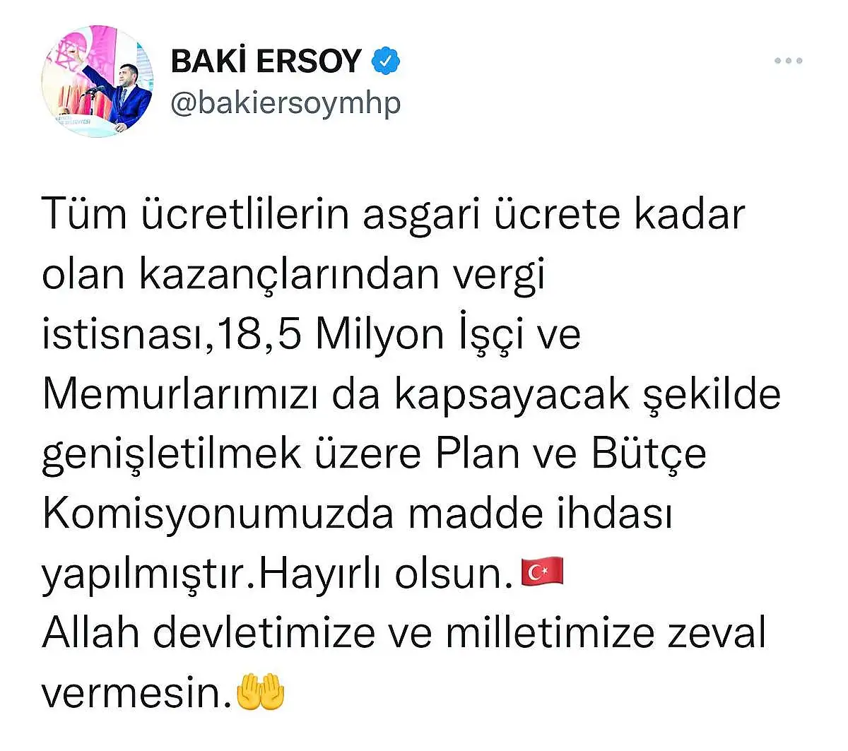 MHP Kayseri Milletvekili Baki Ersoy da konuyla ilgili şu açıklamayı yaptı: “Tüm ücretlilerin asgari ücrete kadar olan kazançlarından vergi istisnası, 18,5 milyon işçi ve memurlarımızı da kapsayacak şekilde genişletilmek üzere plan ve bütçe komisyonumuzda madde ihdası yapılmıştır. Hayırlı olsun. Allah devletimize ve milletimize zeval vermesin.”