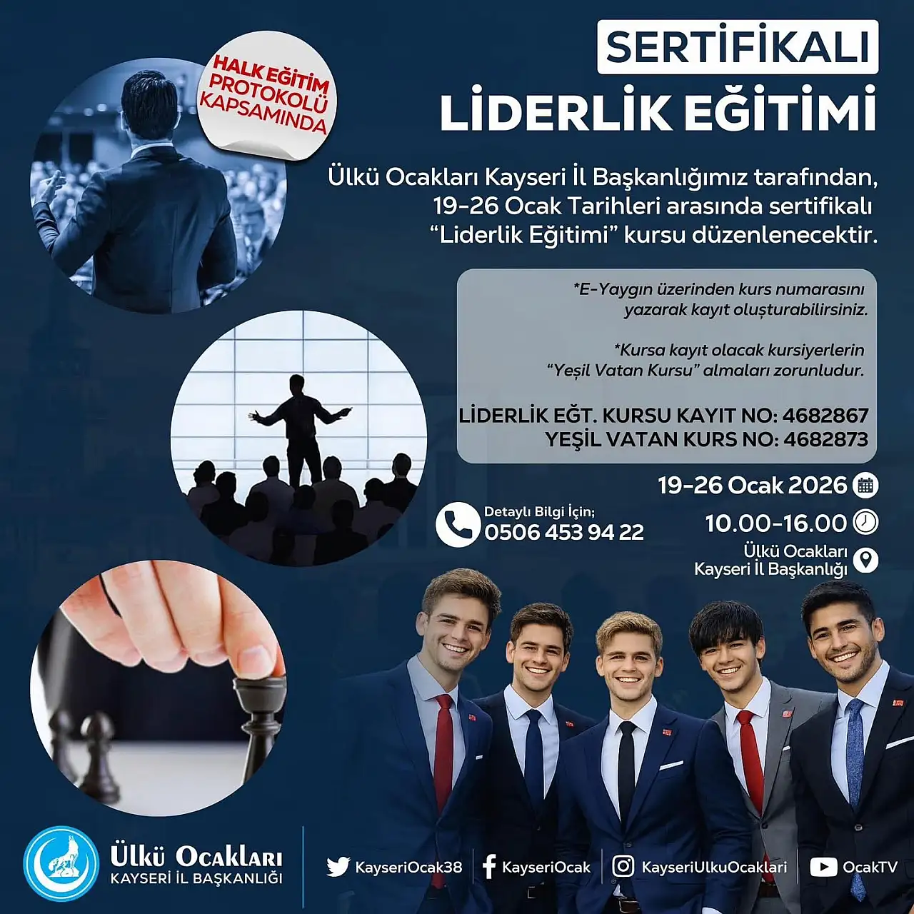 Ülkü Ocakları Kayseri İl Başkanlığı tarafından, Halk Eğitim Protokolü kapsamında Sertifikalı Liderlik Eğitimi düzenleneceği duyuruldu. Geleceğe yön verebilen, sorumluluk alabilen ve duruş sahibi lider öğrenciler yetiştirmeyi amaçlayan eğitim programı, 19–26 Ocak 2026 tarihleri arasında gerçekleştirilecek. Ülkü Ocakları Kayseri İl Başkanı Halit Yağmur, program ile liderlik kursu ile özgüveni yüksek, milli ve manevi değerlerle donanmış, bulunduğu her ortamda fark oluşturabilen gençlerin yetiştirilmesi hedeflediklerini ve eğitim sürecinde katılımcılara liderlik becerilerinin yanı sıra bilgi, ahlak ve ülkü bilinci kazandırılmasını da amaçlandığını ifade etti.