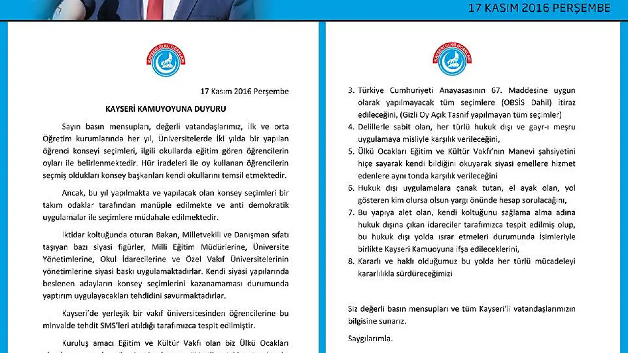 Ülkü Ocakları Kayseri İl Başkanı Aytaç Gezici, ilk ve orta öğretim kurumlarında her yıl, üniversitelerde ise iki yılda bir yapılan öğrenci konseyi seçimlerine yapılan müdahaleyi sert bir dille eleştirdi. Gezici, ""İktidar koltuğunda oturan Bakan, Milletvekili ve Danışman sıfatı taşıyan bazı siyasi figürler, Milli Eğitim Müdürlerine, Üniversite Yönetimlerine, Okul İdarecilerine ve Özel Vakıf Üniversitelerinin yönetimlerine siyasi baskı uygulamaktadırlar."dedi.