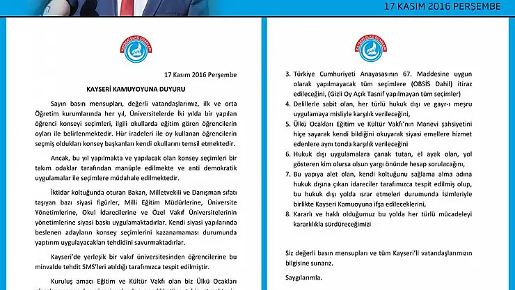 8. Kararlı ve haklı olduğumuz bu yolda her türlü mücadeleyi kararlılıkla sürdüreceğimizi Siz değerli basın mensupları ve tüm Kayseri’li vatandaşlarımızın bilgisine sunarız."