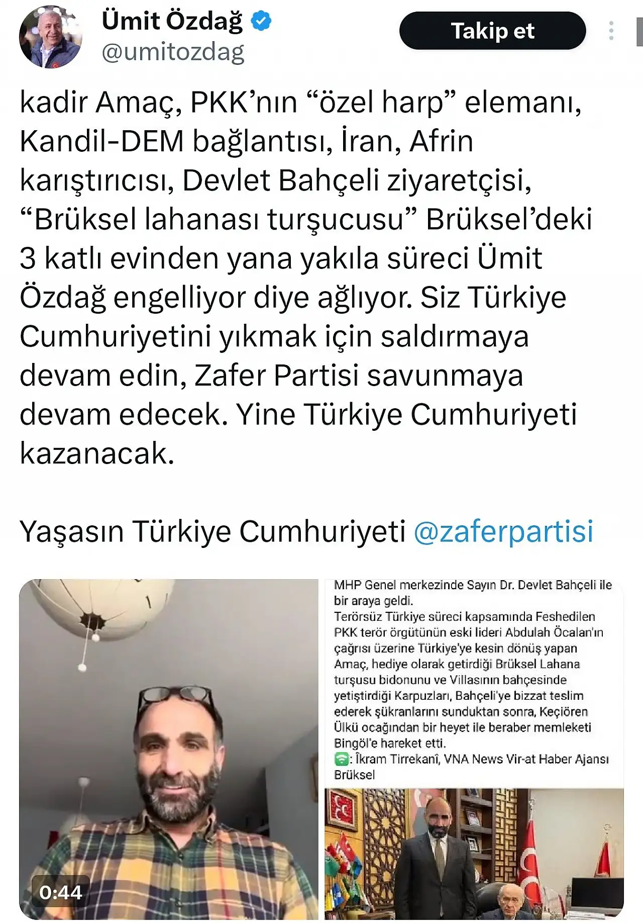 Zafer Partisi Genel Başkanı Ümit Özdağ, MHP Kayseri Milletvekili Baki Ersoy’a ait olduğu bilinen Devlet Bahçeli’nin makamında çekilmiş bir fotoğrafın fotomontaj halini sosyal medya hesabından paylaştı. Özdağ, fotomontaj görsel için sosyal medya hesabından paylaşımda bulunarak, “kadir Amaç, PKK’nın “özel harp” elemanı, Kandil-DEM bağlantısı, İran, Afrin karıştırıcısı, Devlet Bahçeli ziyaretçisi, “Brüksel lahanası turşucusu” Brüksel’deki 3 katlı evinden yana yakıla süreci Ümit Özdağ engelliyor diye ağlıyor” ifadelerini kullandı.