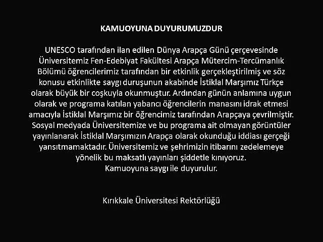 Kırıkkale Üniversitesi'nde İstiklal Marşı'nın Arapça okunduğu bir etkinlik düzenlendi.Etkinlikteki İstiklal Marşı'nın Arapça okunması üzerine Rektörlük'ten olayla ilgili, 'Yabancı öğrencilerin anlaması için bir öğrenci arkadaşımız tarafından Arapça okundu