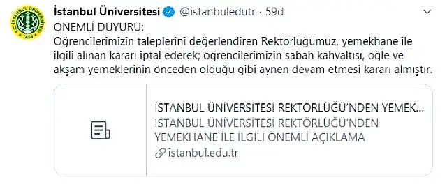 İstanbul Üniversitesi Twitter hesabı üzerinden yaptığı açıklamayla yemekhanelerle ilgili alınan kararın iptal edildiğini açıkladı. Açıklamada, "Öğrencilerimizin taleplerini değerlendiren Rektörlüğümüz, yemekhane ile ilgili alınan kararı iptal ederek; öğrencilerimizin sabah kahvaltısı, öğle ve akşam yemeklerinin önceden olduğu gibi aynen devam etmesi kararı almıştır" ifadeleri kullanıldı.