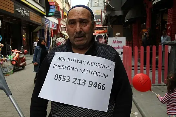 "İhtiyacım var, 9 bin 900 lira, ev kiram, engelli arabam ve oksijen makinesi istiyorum" Kafeler Caddesi’nde vatandaşların şaşkın bakışları arasında üzerine astığı ve "Acil ihtiyaç nedeniyle böbreğimi satıyorum" yazısıyla dolaşan Demir, "İhtiyacım var, 9 bin 900 lira. Ev kiram, engelli arabam ve oksijen makinesi istiyorum. Başka bir şey istemiyorum. Gelirim yok, hiçbir şeyim yok" dedi.