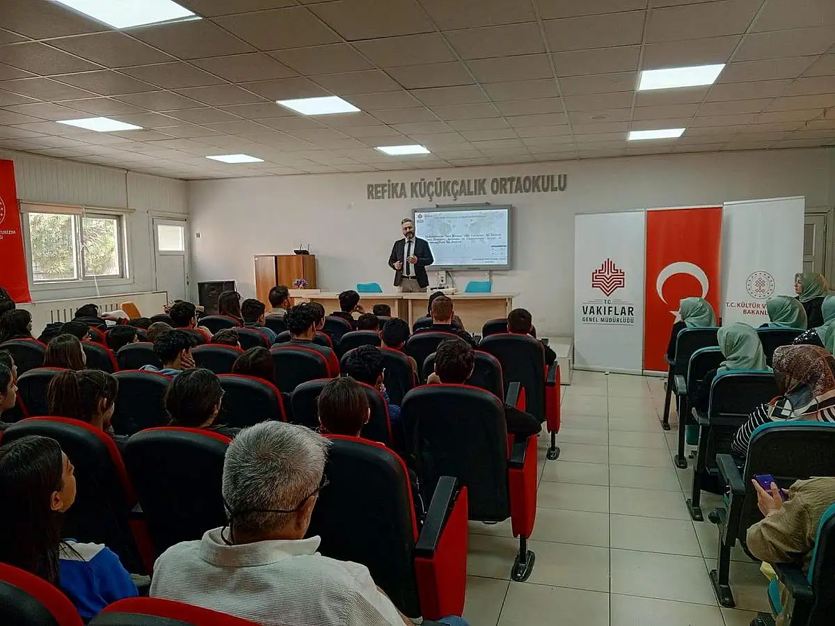 Etkinliklerin ikinci ayağında Refika Küçükçalık Ortaokulu’nda öğrencilere yönelik olarak vakıfların tarihî, kültürel ve sosyal yapımızdaki yeriyle ilgili sunum gerçekleştirildi. Sunum, Kayseri Vakıflar Bölge Müdürlüğü Sanat Eserleri ve Yapı İşleri Şube Müdürü Taha Demirci tarafından yapıldı. Katılımcılara “Vakıf Nedir?”, “Tarihte Vakıflar” ve “Vakıf Kültürünün Günümüzdeki Yansımaları” başlıkları aktarılırken, vakıf bilincinin gelecek nesillere aktarılmasının önemi vurgulandı.