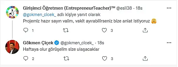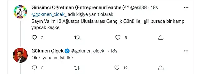 Sosyal medya üzerinden tweete cevap veren Vali Çiçek: “Olur yapalım iyi fikir” şeklinde paylaşımda bulundu. Bunun üzerine kamp düzenlenmesini isteyen vatandaş projeyi hazırladıklarını şu sözlerle duyurdu: “Projemiz hazır sayın valim, vakit ayırabilirseniz bize anlat istiyoruz” Bu sözler üzerine Vali Çiçek, yine sosyal medya üzerinden “Haftaya olur görüşelim, size ulaşacaklar” şeklinde karşılık verdi.