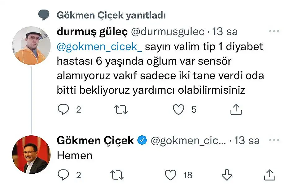 Kayseri Valisi Gökmen Çiçek, sosyal medya platformu Twitter üzerinden yardım isteyen vatandaşa yanıt verdi. Şeker hastası oğlu için Vali Çiçek’ten yardım isteyen Durmuş Güleç isimli vatandaş: “Sayın valim tip 1 diyabet hastası 6 yaşında oğlum var. Sensör alamıyoruz. Vakıf sadece iki tane verdi, oda bitti. Bekliyoruz yardımcı olabilir misiniz?” şeklinde tweet attı.