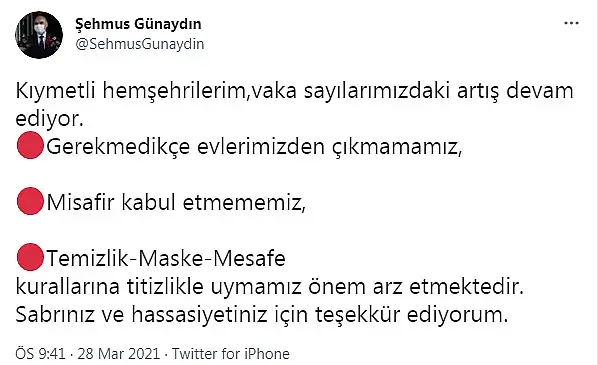 Temizlik-Maske-Mesafe kurallarına titizlikle uymamız önem arz etmektedir. Sabrınız ve hassasiyetiniz için teşekkür ediyorum" ifadelerini kullandı.