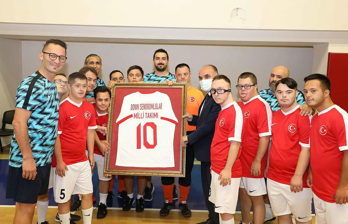 Burada, Vali Günaydın’a down sendromlular futsal milli takımının 10 numaralı forması hediye edildi. Vali Günaydın ise oyunculara Kayserispor forması hediye etti.
