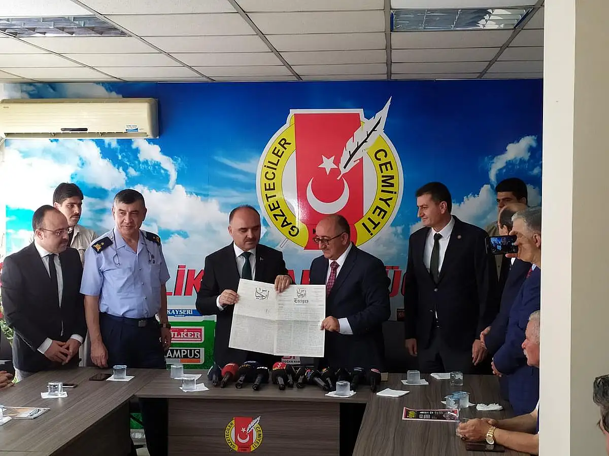 Konuşmalardan sonra Başkan Altınkaya, Vali Günaydın’a Kayseri’de çıkan ilk gazeteyi hediye etti. Ziyaret gazetecilere pasta ikramı ile sona erdi. Ziyarette Vali Günaydın’ın yanında Garnizon Komutanı Tuğgeneral Ercan Teke, Melikgazi Kaymakamı Erkaya Yırık, Kocasinan Kaymakamı Mustafa Kılıç, Hacılar Kaymakamı Haluk Sezen ve Cumhuriyet Başsavcısı Abdulkadir Akın’da vardı.
