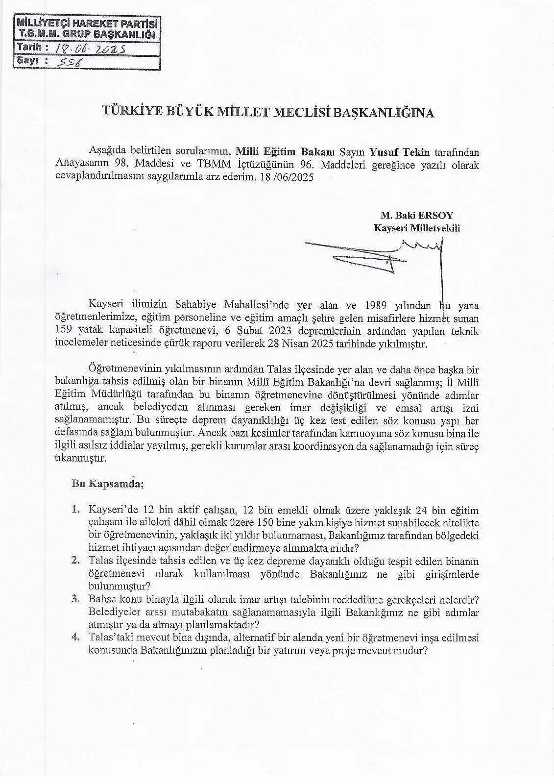 Milliyetçi Hareket Partisi Kayseri Milletvekili Baki Ersoy, 6 Şubat depremlerinin ardından alınan karar ile yıkılan öğretmenevini Milli Eğitim Bakanı Yusuf Tekin’e sordu. Henüz yeni bir yapının inşa edilmemesi ve tahsis edilen binanın kullanıma açılmaması üzerine verilen yazılı soru önergesine ilişkin açıklama yapan Ersoy, sürecin bir an önce tamamlanması için konunun takipçisi olacaklarını söyledi.