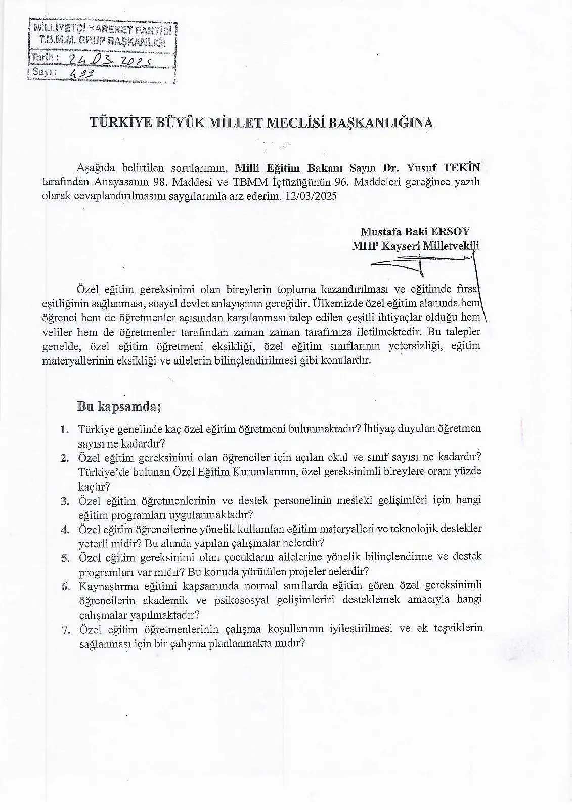 Milliyetçi Hareket Partisi Kayseri Milletvekili Baki Ersoy, özel eğitime ihtiyaç duyan bireyler için fırsat eşitliği sağlanması için Milli Eğitim Bakanlığı'nın çalışmalarını gündemine aldı.Ersoy, Milli Eğitim Bakanı Yusuf Tekin'e verdiği yazılı soru önerg