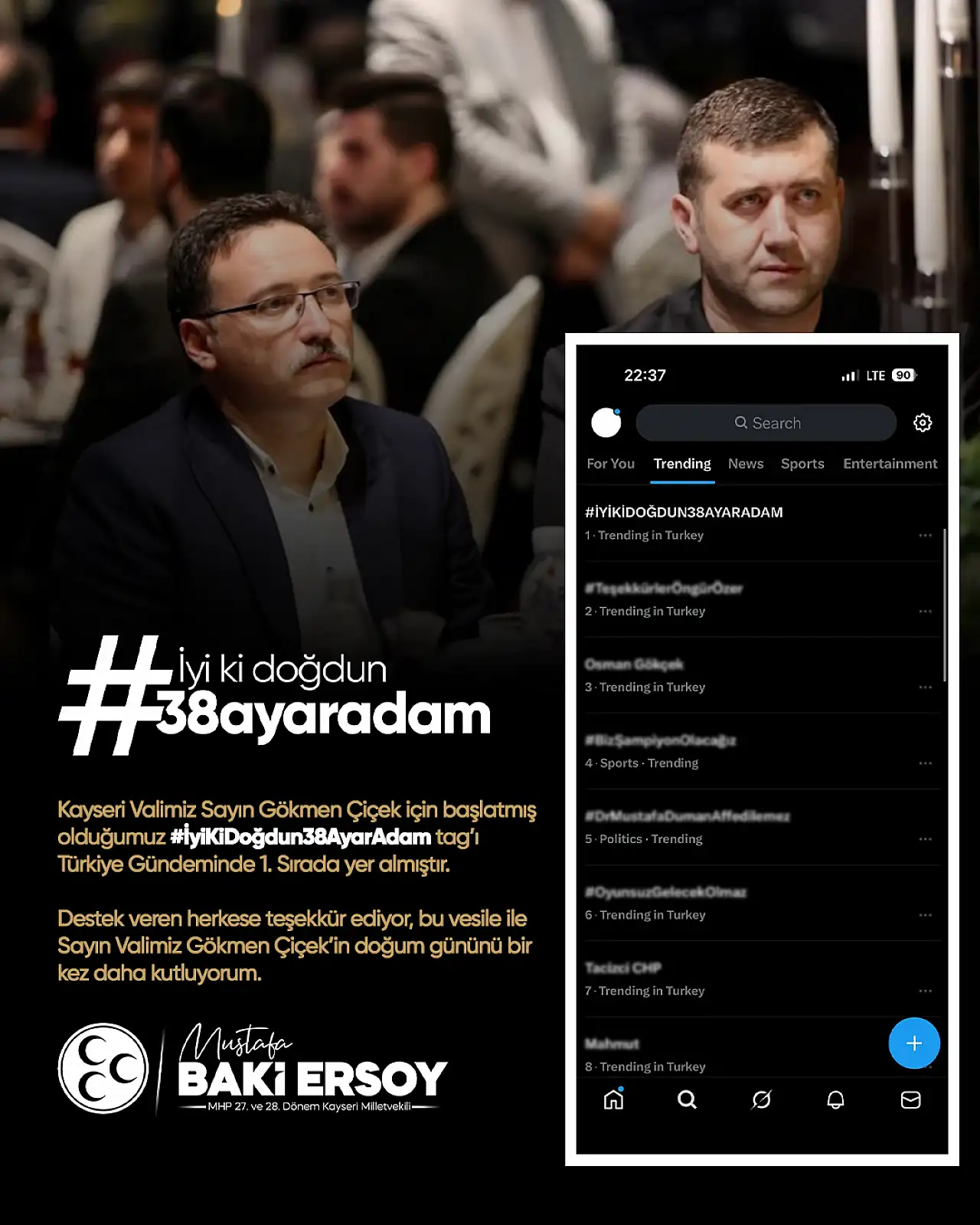 Geçtiğimiz yıl Kayseri’de 38AyarAdam ifadesi tüm billboardlara asılarak şehrin gündemine oturmuş 5 Şubat tarihinde 38AyarAdam’ın Kayseri Valisi Gökmen Çiçek olduğu açıklanmıştı. Vali Çiçek’in özellikle 6 Şubat depremleri sonrası deprem bölgelerinde yürüttüğü çalışmalar ve sahadaki aktif rolüne atıfta bulunulan 38AyarAdam ifadesi bugün doğum günü dolayısıyla yeniden gündeme taşındı. MHP Kayseri Milletvekili Baki Ersoy tarafından, Vali Çiçek’in doğum günü dolayısıyla başlatılan #İyiKiDoğdun38AyarAdam etiketi, sosyal medya platformu X’te gündem oldu. Ayrıca Vali Gökmen Çiçek için hazırlanan özel klip ve beste ile paylaşılan video da Kayserililerden yüzlerce yorum ve beğeni aldı.