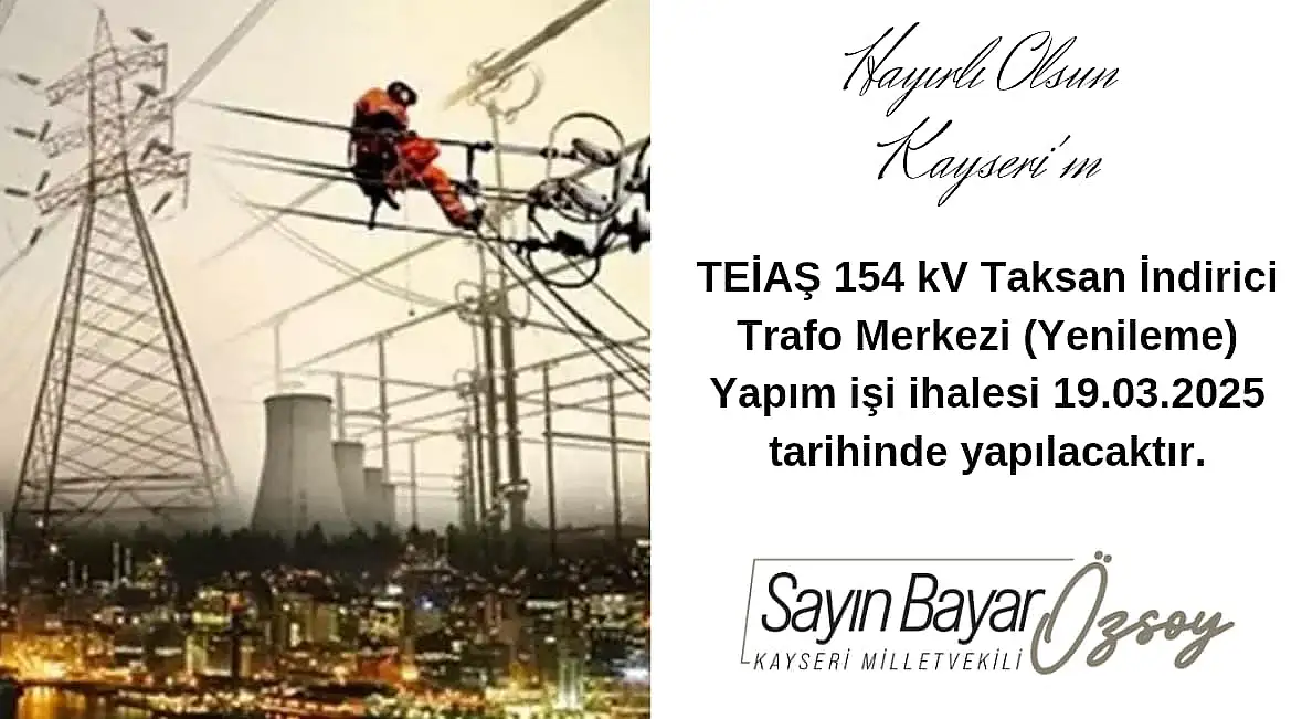 Kayseri’de enerji altyapısını güçlendirecek yatırım hayata geçiriliyor. TEİAŞ 154 kV Taksan İndirici Trafo Merkezi (Yenileme) yapım işi ihalesi, 19 Mart 2025 tarihinde yapılacak. AK Parti Kayseri Milletvekili Sayın Bayar Özsoy ihaleyi duyurarak, “Tamamlandığında toplam maliyeti 300 Milyon TL olacaktır” dedi.