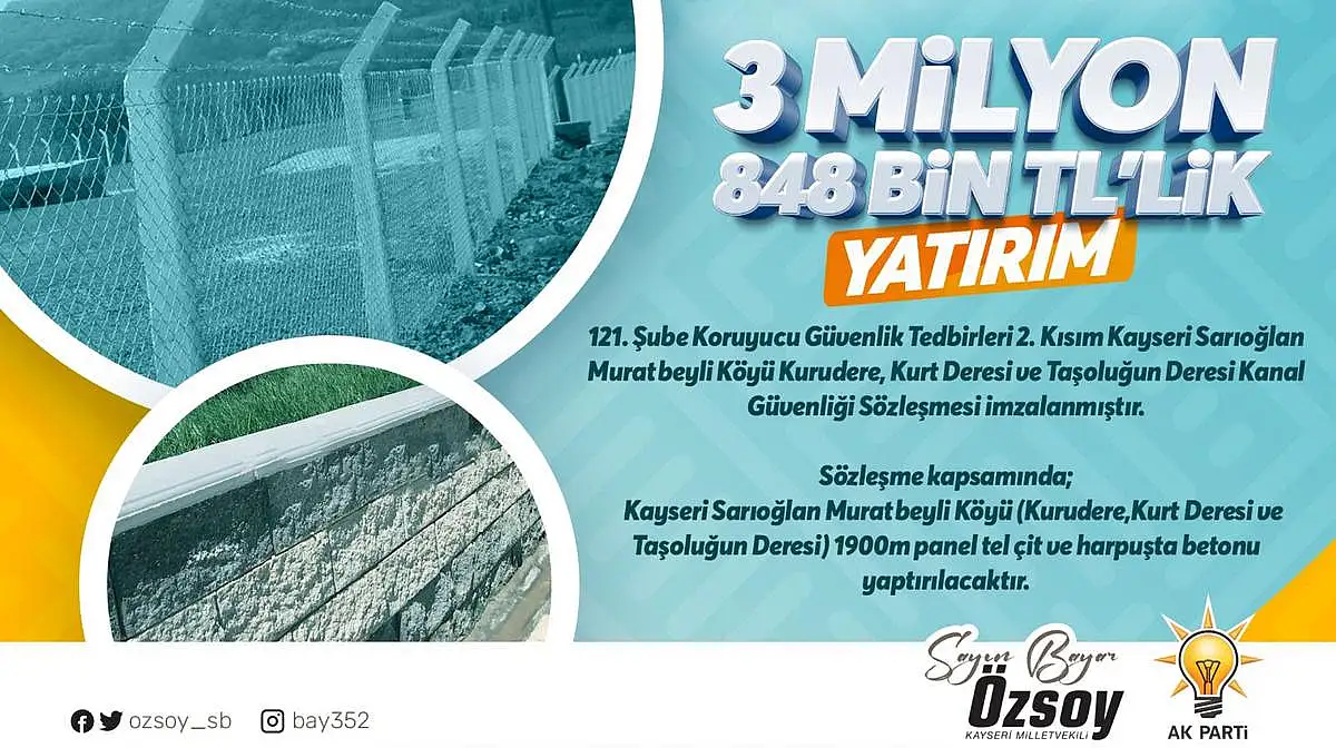 AK Parti Kayseri Milletvekili Sayın Bayar Özsoy, 121. Şube Koruyucu Güvenlik Tedbirleri 2. Kısım Sarıoğlan Muratbeyli Köyü Kurudere, Kurt Deresi ve Taşoluğun Deresi’nin Kanal Güvenliği Sözleşmesi’nin imzalandığını sosyal medya hesabından yapmış olduğu paylaşımla duyurdu.