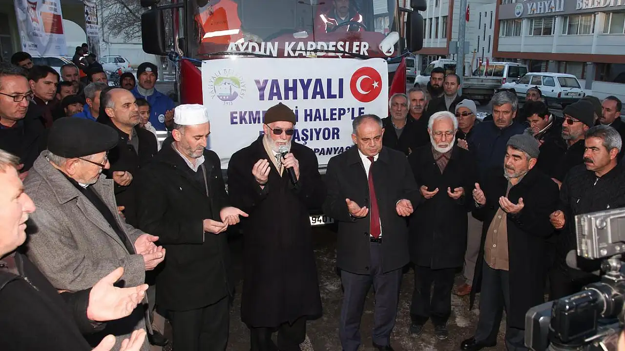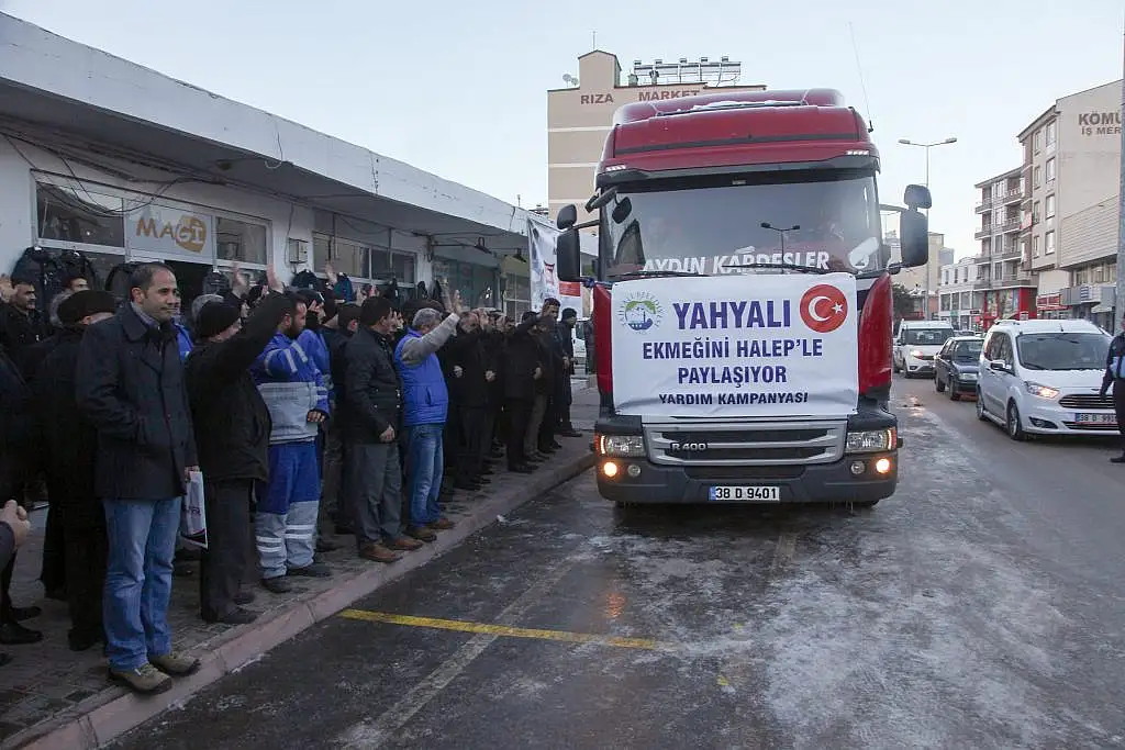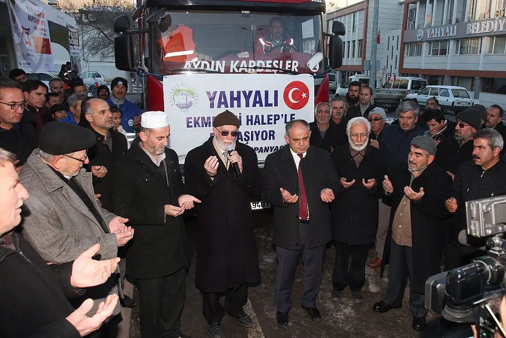 Yahyalı'da Halep'te yaşayan insanlar için toplanan gıda yardımları dualarla uğurlandı.Yahyalı Belediyesi ve Yahyalı İlçe Müftülüğü tarafından 'Yahyalı Ekmeğini Halep'le Paylaşıyor' kampanyasında toplanan gıda yardımları düzenlenen uğurlama töreni ile Kili