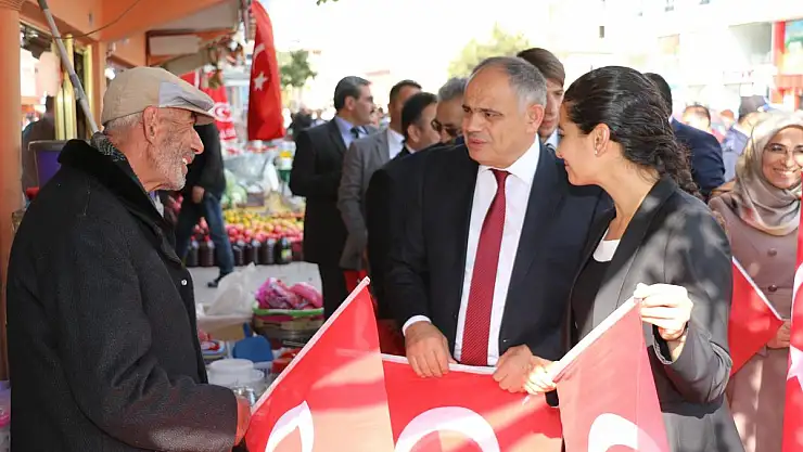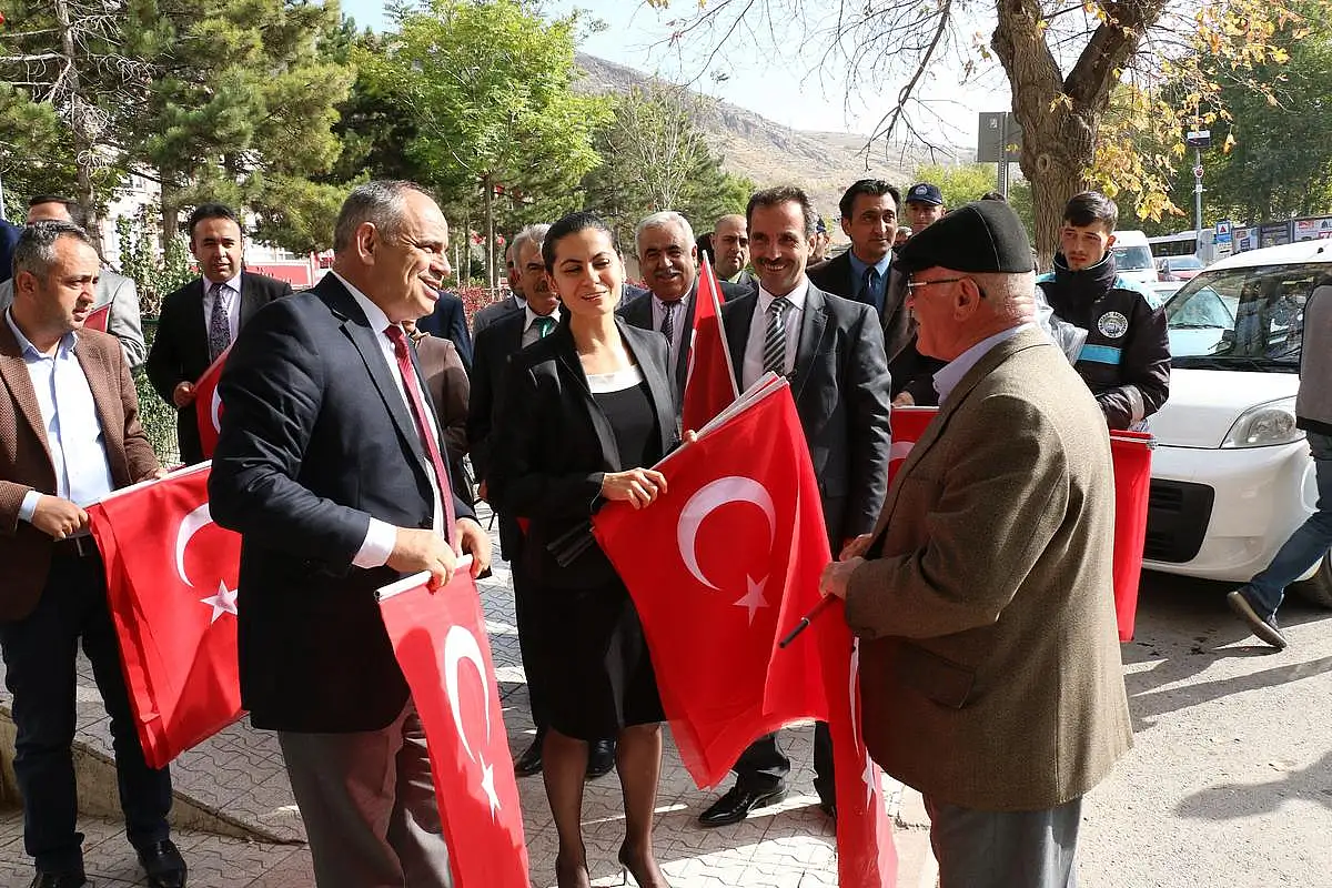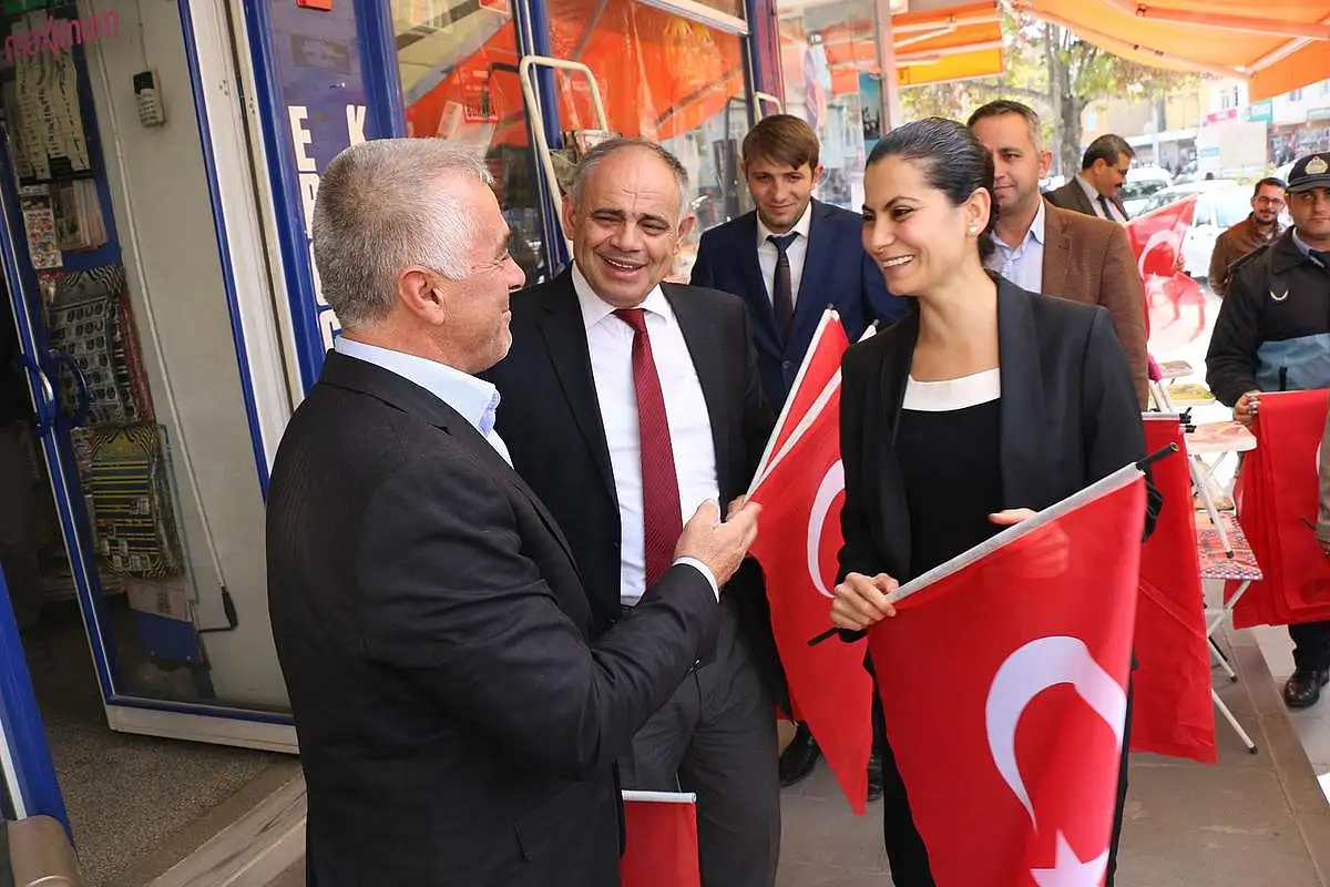 Ellerinde Türk Bayraklarıyla ilçeyi gezen Protokol Üyeleri, halkın ve esnafın Cumhuriyet Bayramını kutlayarak, dükkanlarına, evlerine ve arabalarına asmaları için Türk Bayrağı dağıttı.