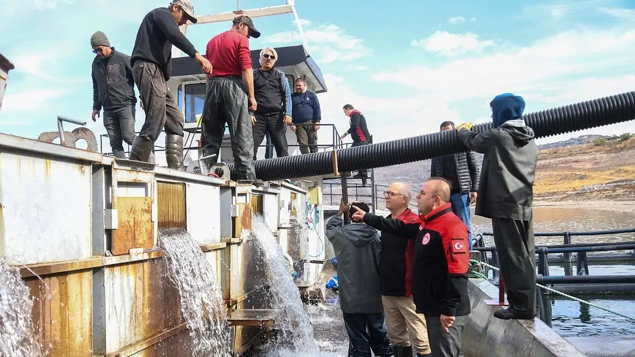 Kayseri'nin Yamula mahallesindeki alabalık çiftliğinde, şubat-mart döneminde hasadı yapılacak Türk somonlarının transferi gerçekleştirildi.