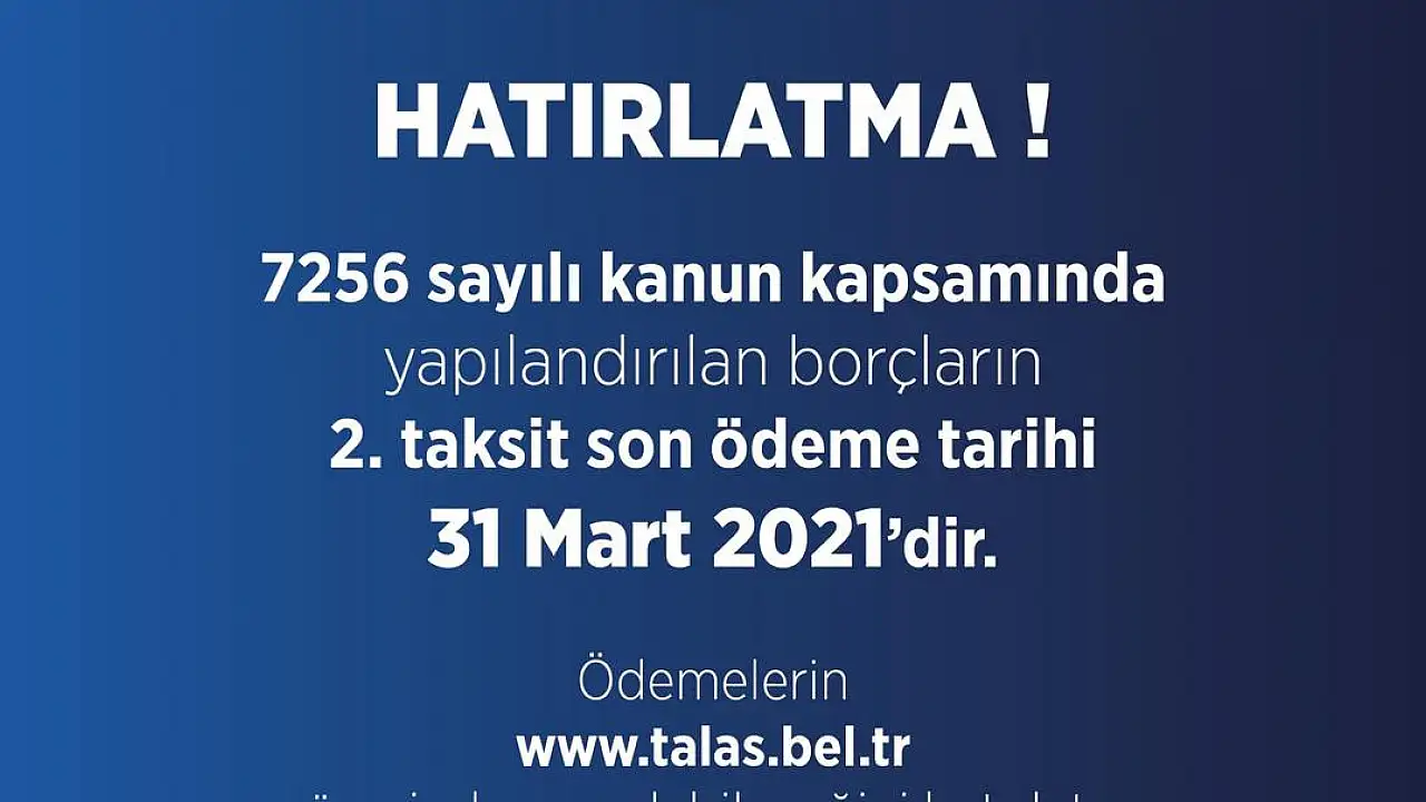 Konuyla ilgili bir hatırlatmada bulunan Talas Belediye Başkanı Mustafa Yalçın, belediyeye olan borçlarını yapılandıran vatandaşların, hak kaybı yaşamaması için taksitlerini düzenli olarak ödemesi gerektiğini ifade ederek, “7256 sayılı kanun kapsamında yapılandırılan borçların 2. Taksit ödemeleri 31 Mart Çarşamba günü sona eriyor. Yapılandırmadan yararlanan Talaslı hemşehrilerimizin bu tarihe kadar 2. taksitlerini ödemesi gerektiğini bir kez daha hatırlatıyorum” dedi.