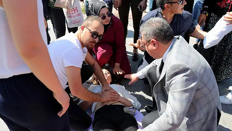 Erciyes Üniversitesi (ERÜ) merkez kampüsü içerisindeki tramvay durağı yanında meydana gelen kazada yaralanan genç kıza ilk müdahaleyi ERÜ Rektörü Prof. Dr. Muhammet Güven yaptı.