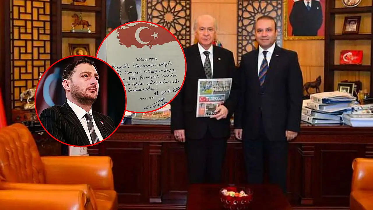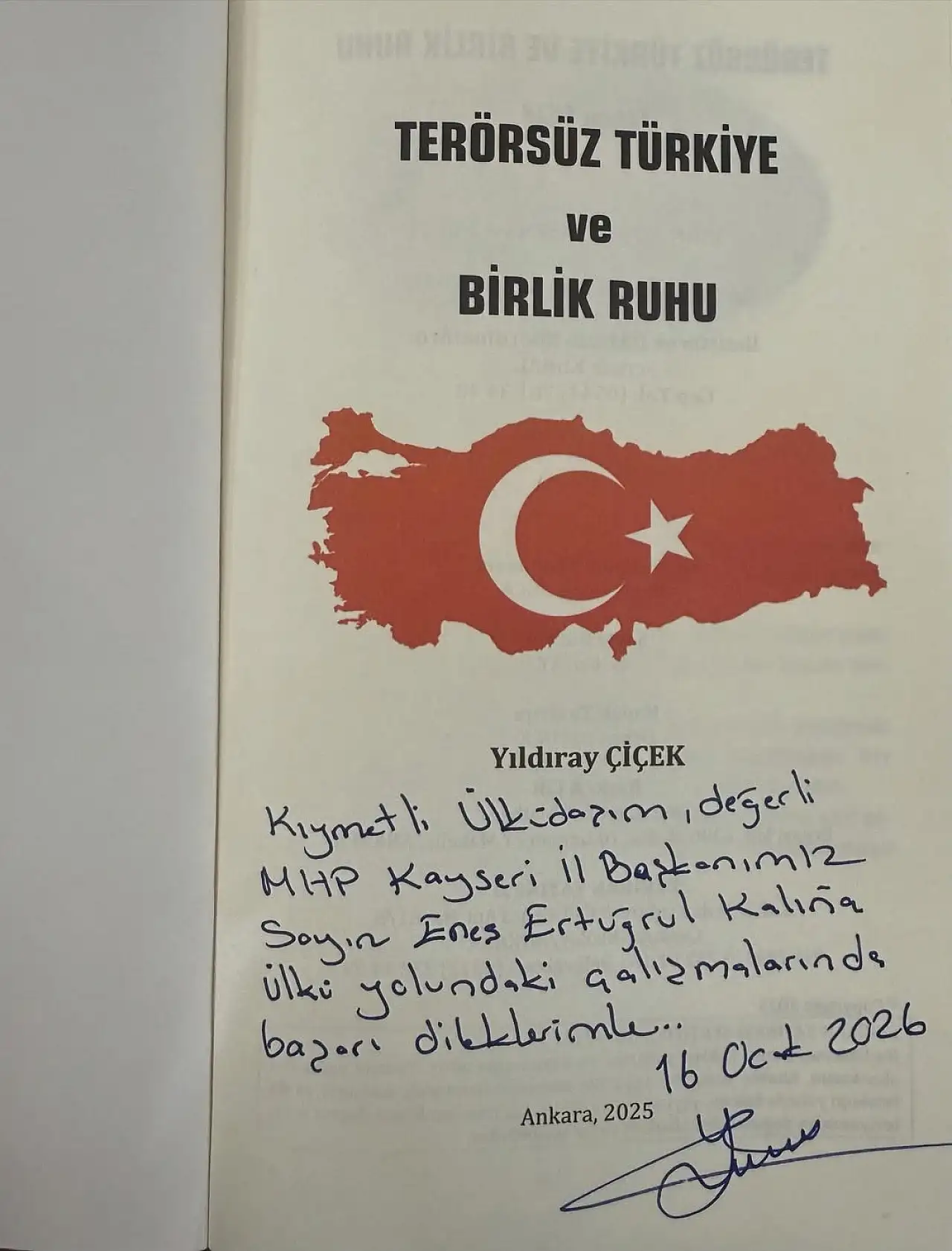 Milliyetçi Hareket Partisi (MHP) Kayseri İl Başkanı Enes Ertuğrul Kalın, MHP Genel Başkanı Basın Danışmanı ve yazar Yıldıray Çiçek'in yeni yayımlanan eserini kendisine imzalayarak hediye etmesinden dolayı teşekkür mesajı yayımladı.