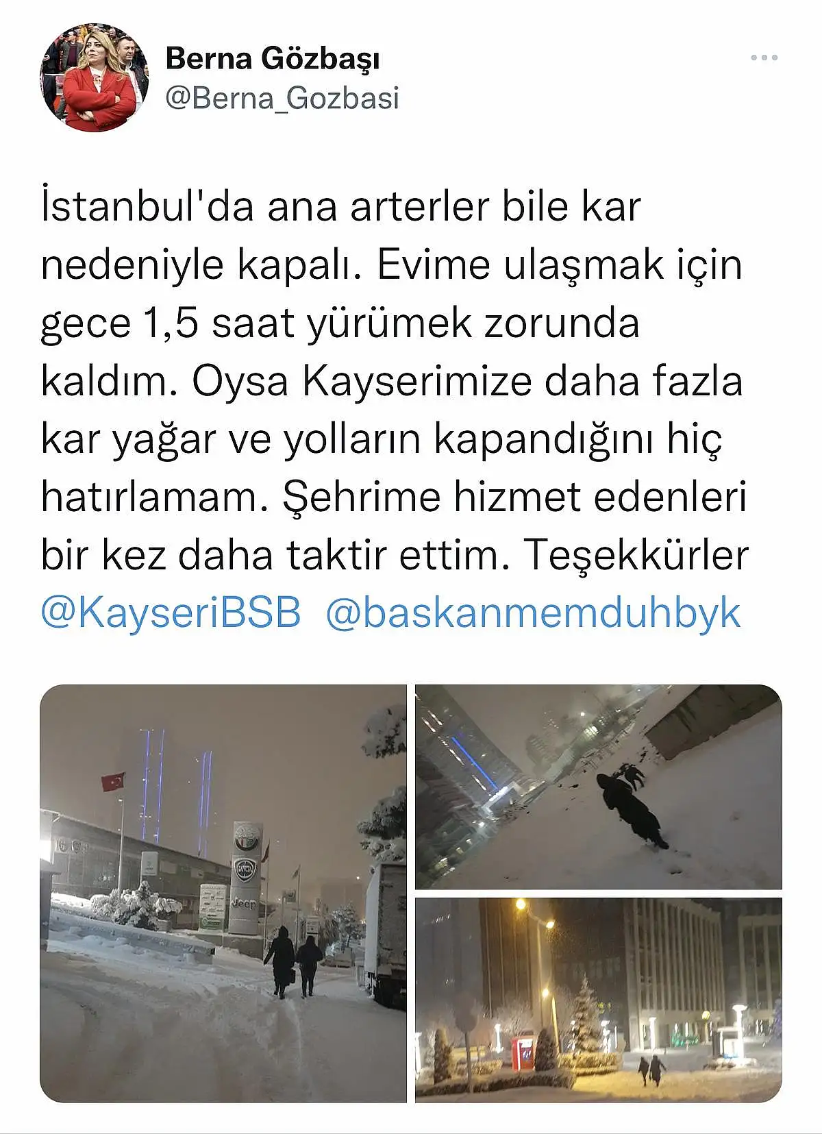 Kayseri’ye İstanbul’dan daha fazla kar yağdığını fakat yolların hiç kapanmadığını ifade eden Gözbaşı, “İstanbul ana arterler bile kar nedeniyle kapalı. Evime ulaşmak için gece 1,5 saat yürümek zorunda kaldım. Oysa Kayseri’mize daha fazla kar yağar ve yolların kapandığını hiç hatırlamam. Şehrimize hizmet edenleri bir kez daha takdir ettim” ifadelerini kullandı.