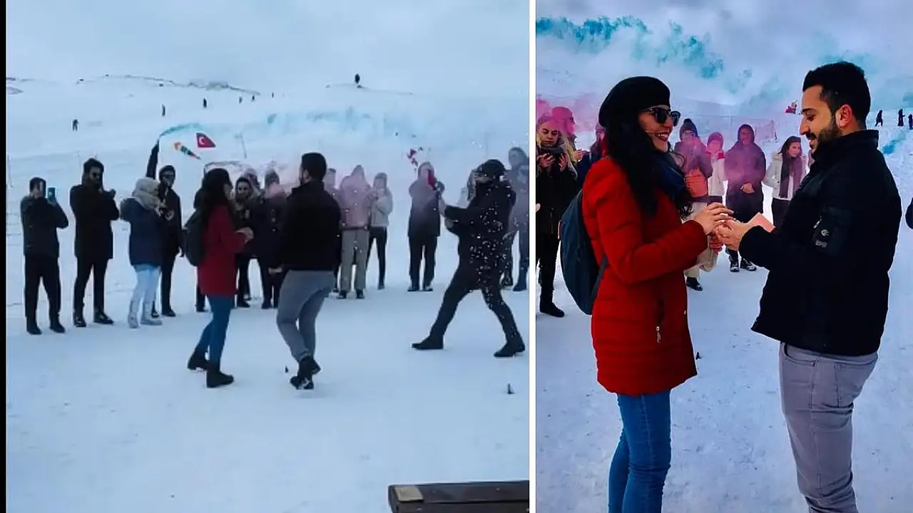 14 Şubat Sevgililer günü sürpriz evlenme tekliflerini de beraberinde getirdi. Kayak mevsiminin başlamasıyla renkli görüntülere sahne olan Erciyes Kayak Merkezi'nde sürpriz bir evlilik teklifi daha yaşandı.